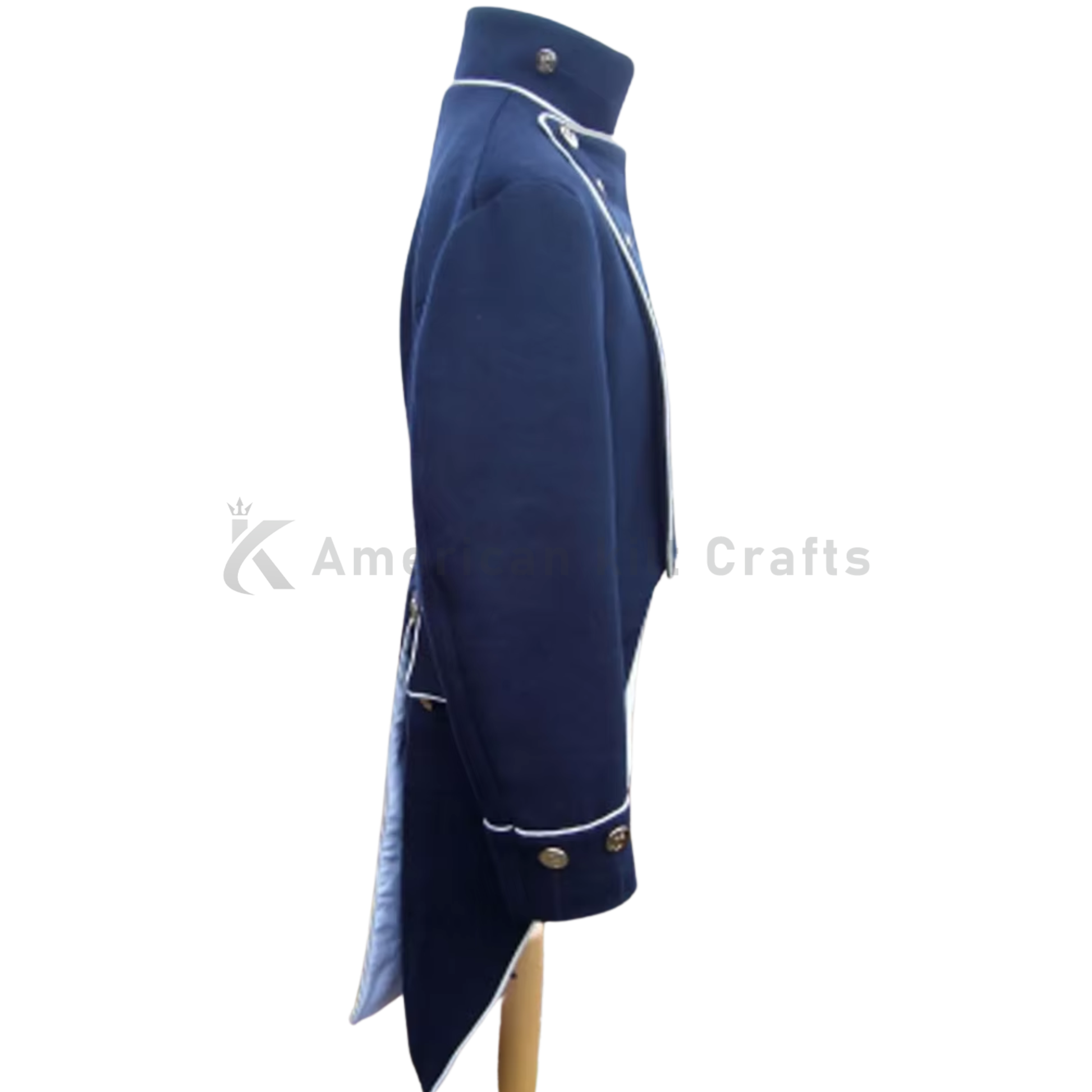 Napoleonic Regency naval lieutenant tail coat inspired by early 19th-century military uniforms. Features a cropped front, long back tails, high standing collar, decorative metal buttons, and white piping.