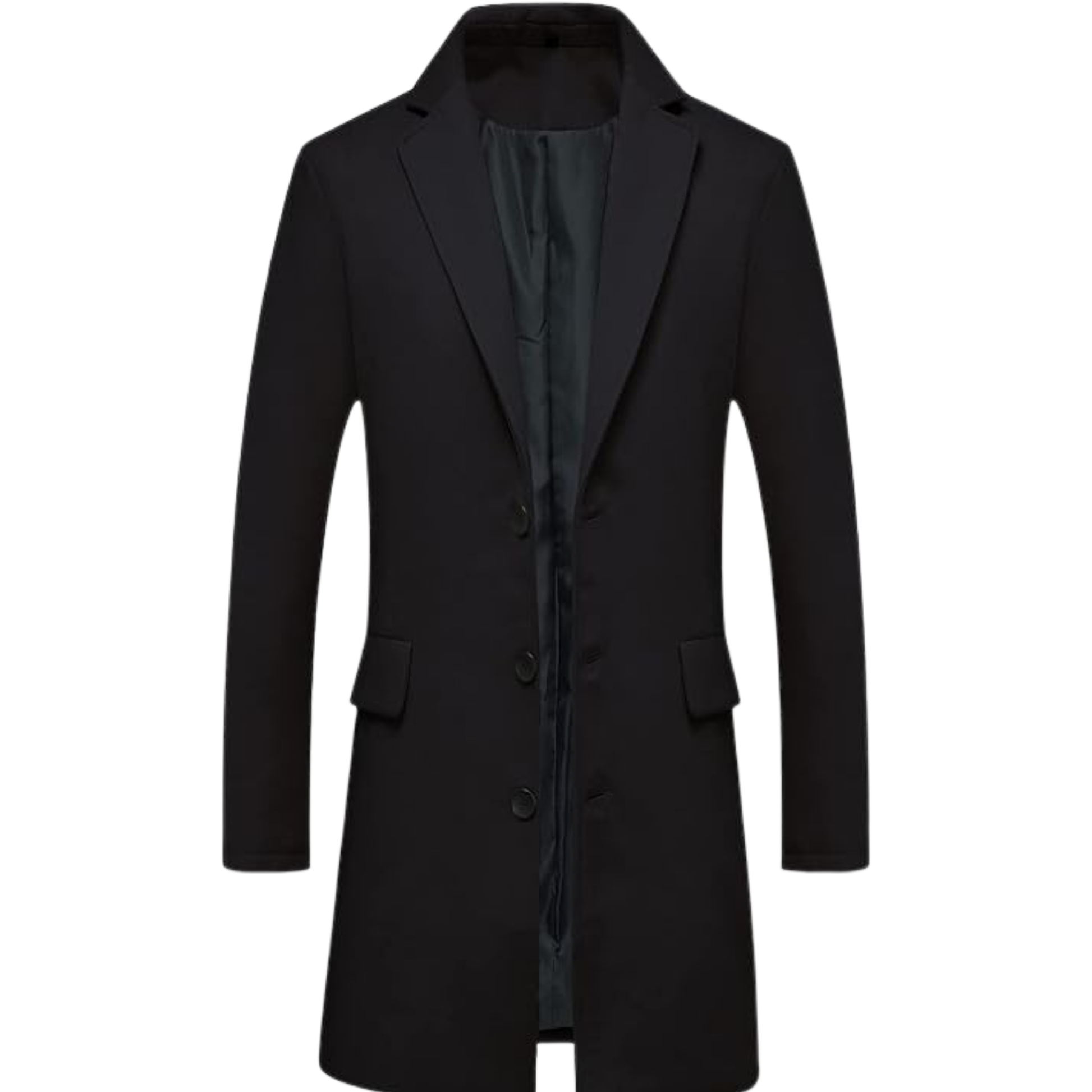 A men’s classic wool trench overcoat designed in a single-breasted style with a three-button front closure. This mid-length wool blend coat features a clean, modern look suitable for winter wear. Practical flap side pockets and an inner pocket provide secure storage, making this coat ideal for both formal and casual use.