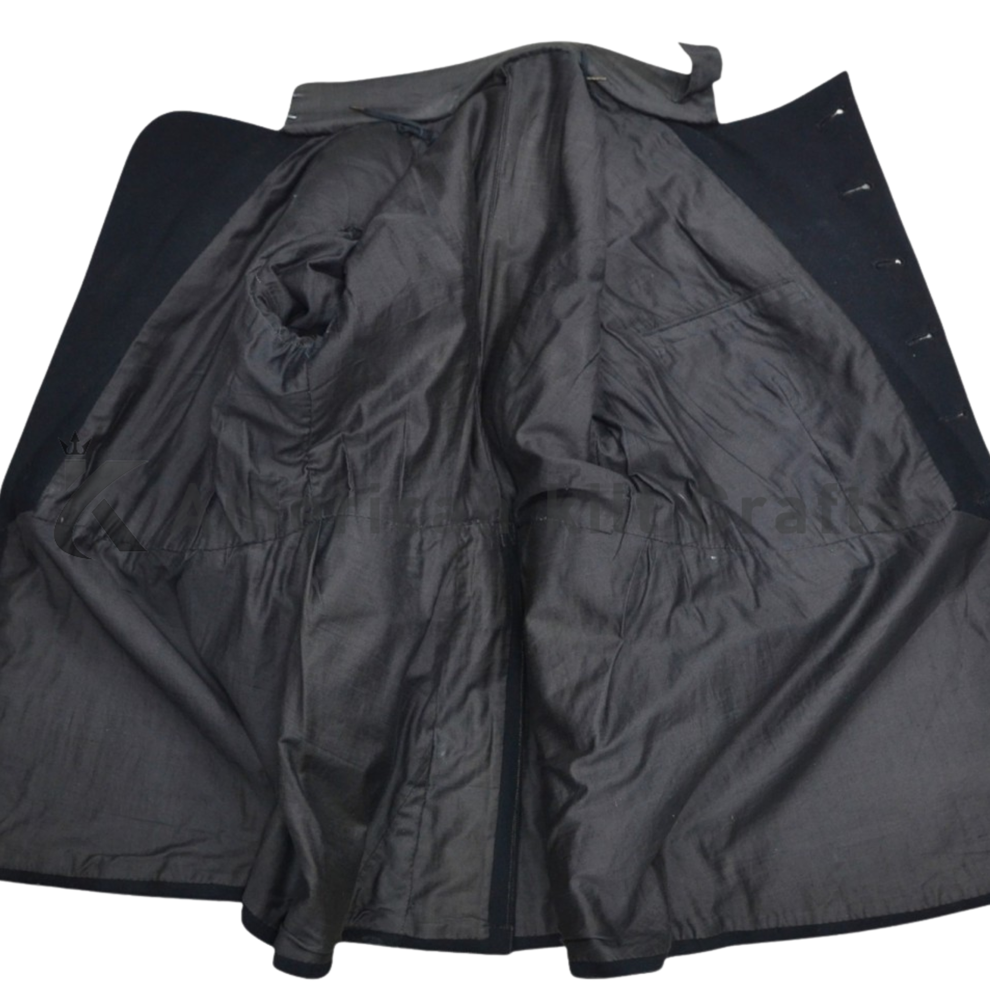 An Imperial Russian Life Guards Jaeger Regiment officer’s dress uniform designed as a formal double-breasted frock coat. This dark military coat features silver buttons, detailed gold embroidery on the stand-up collar and cuffs, and general-rank shoulder boards with gold and red piping, reflecting high-ranking Russian imperial military style.