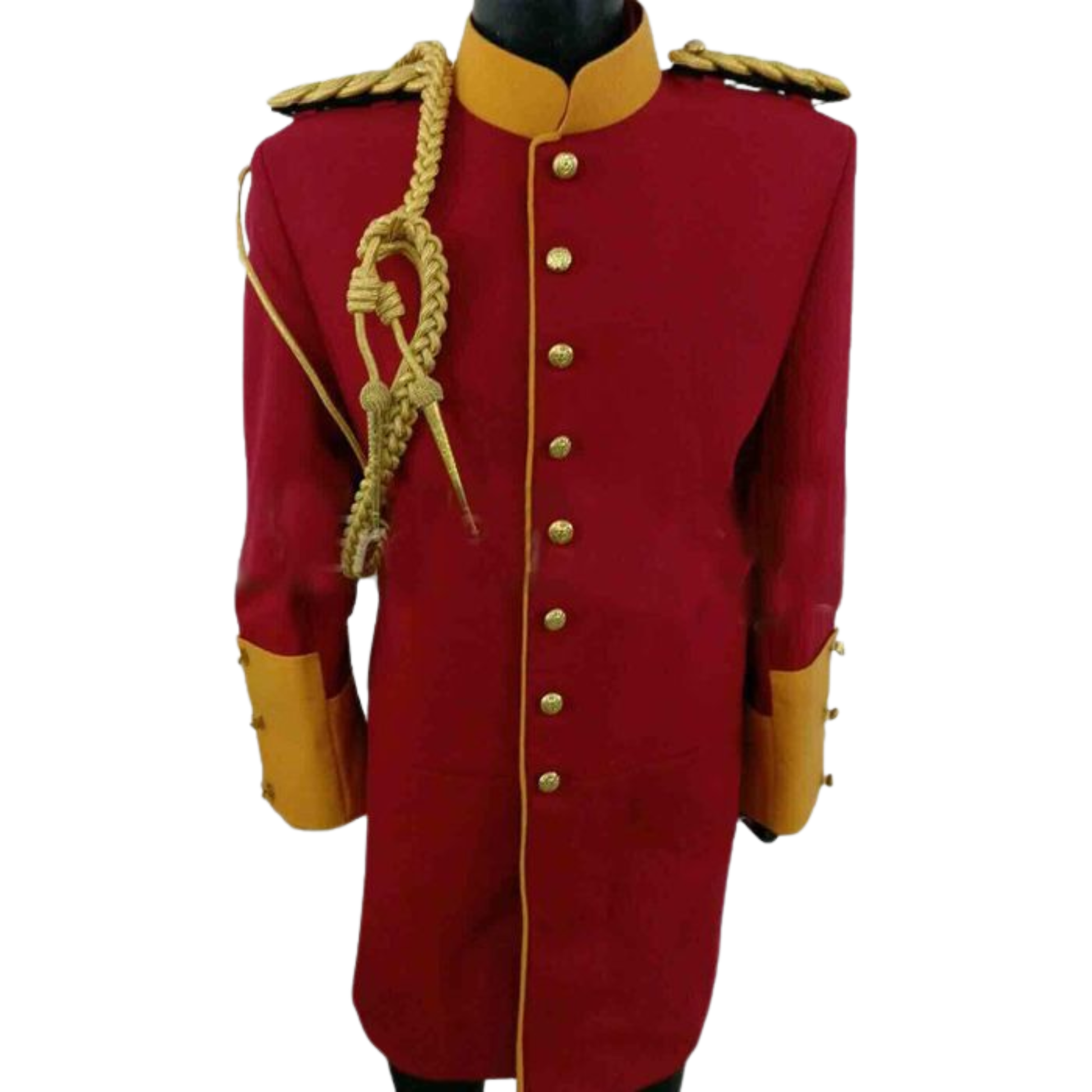 The coat features polished brass buttons down the front, decorative gold shoulder cords, and detailed gold braiding to enhance its regal and commanding appearance. The long-length design.