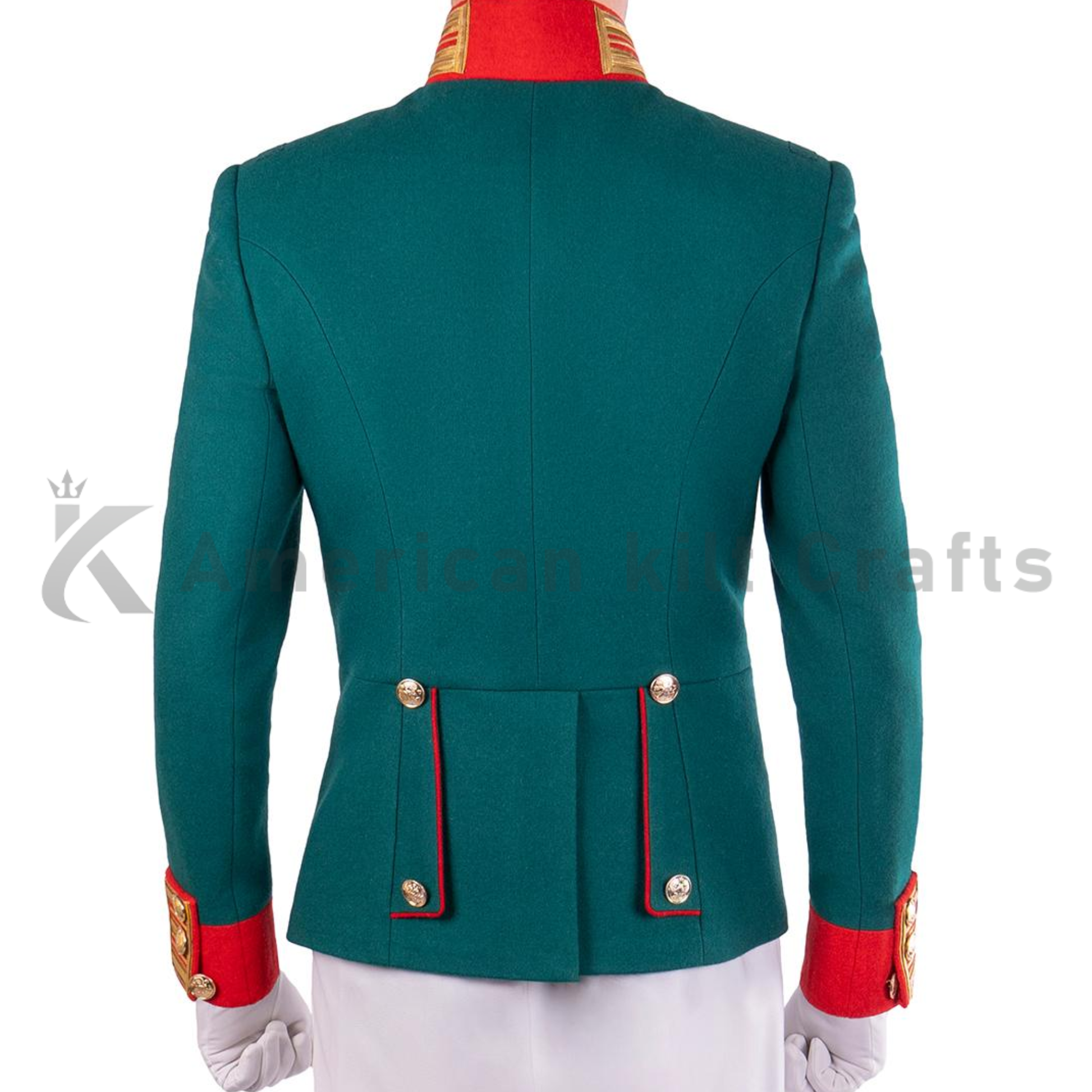 This custom-made double-breasted military uniform jacket is crafted in a deep emerald green High quality wool with red piping details.This historical jacket Inspired by historic officer uniforms, the jacket features a high red stand collar, gold braid decorations, and structured tailoring for an authentic ceremonial look.