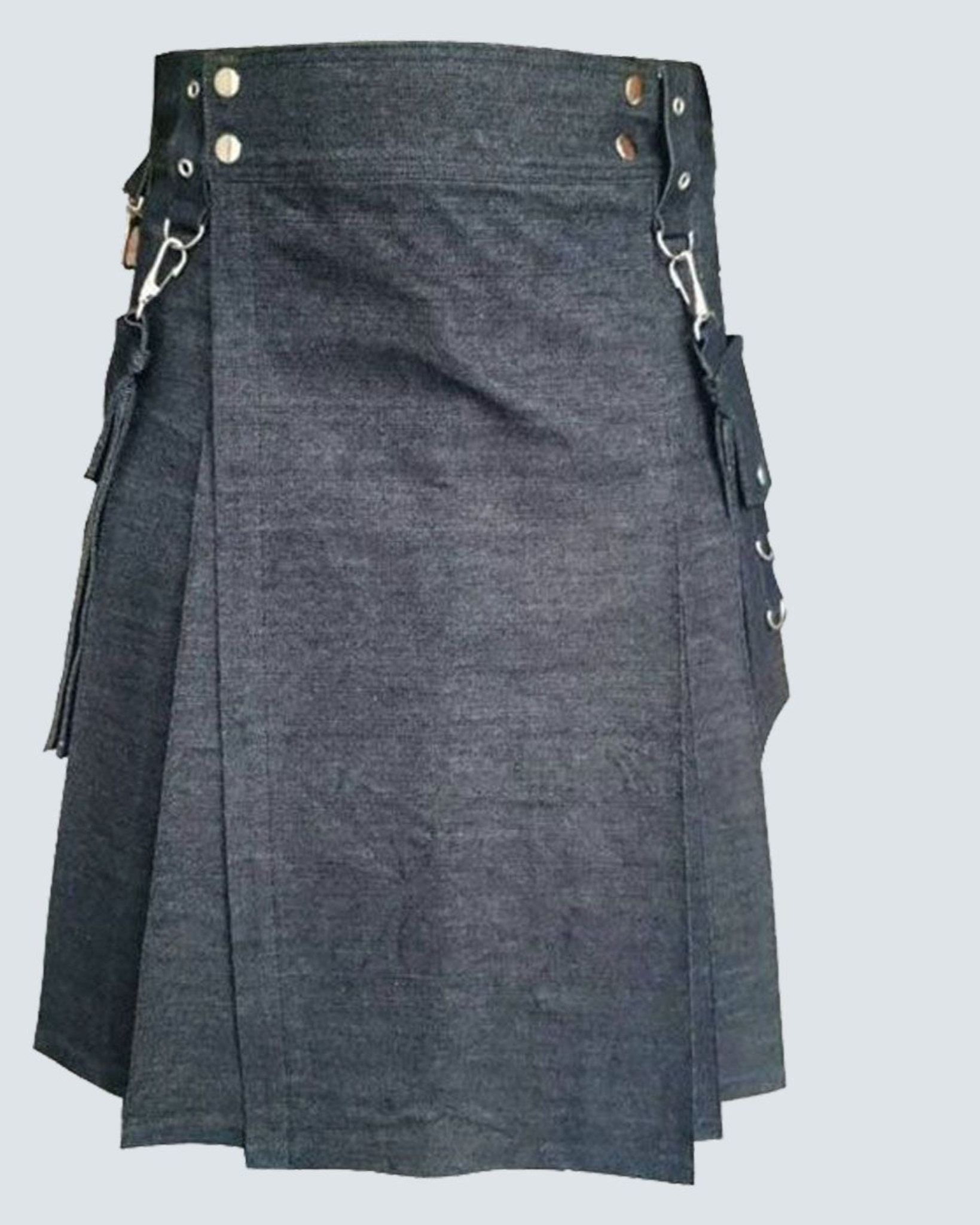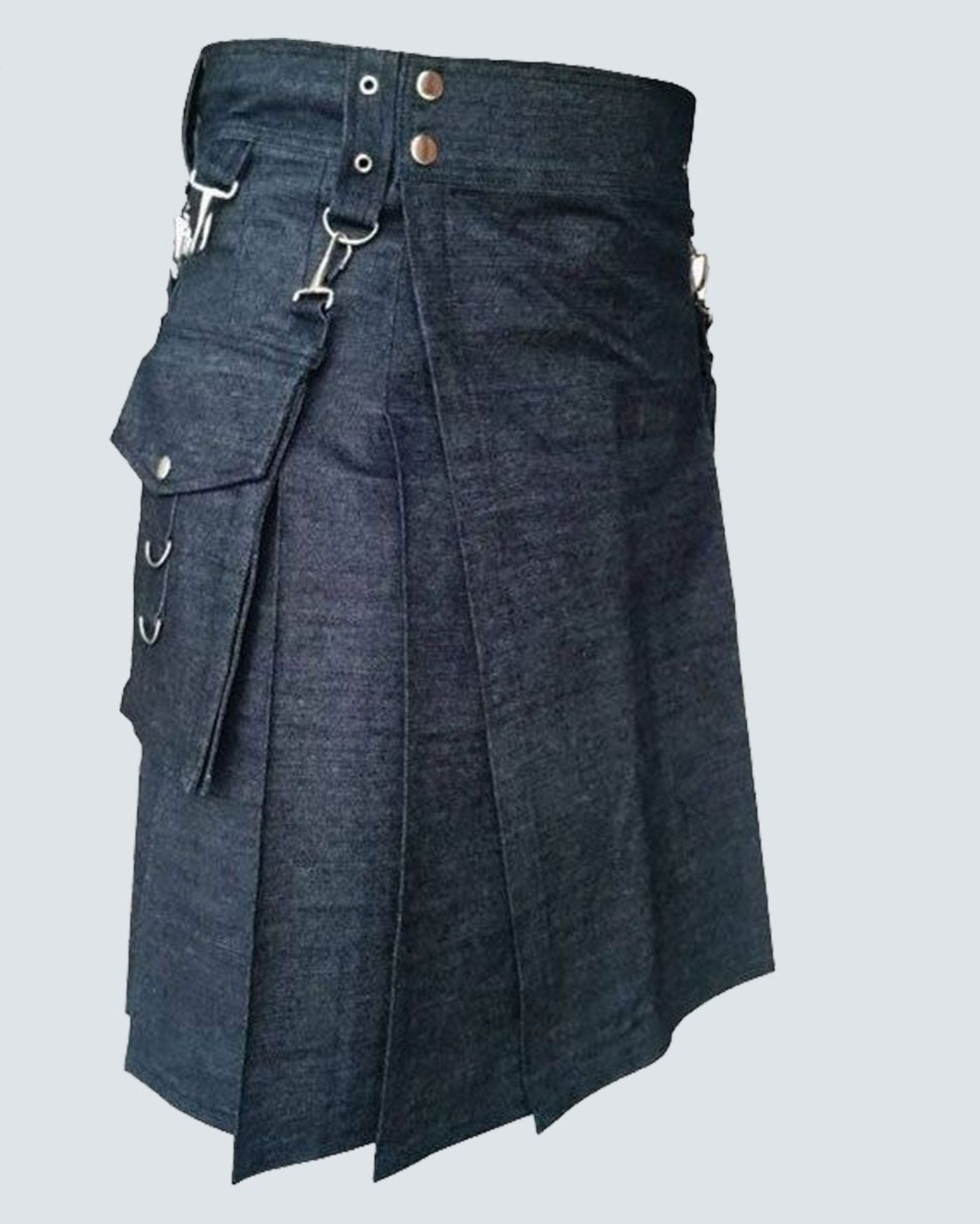 Dark Blue Tactical Denim Utility Kilt with Cargo Pockets & Metal Hooks