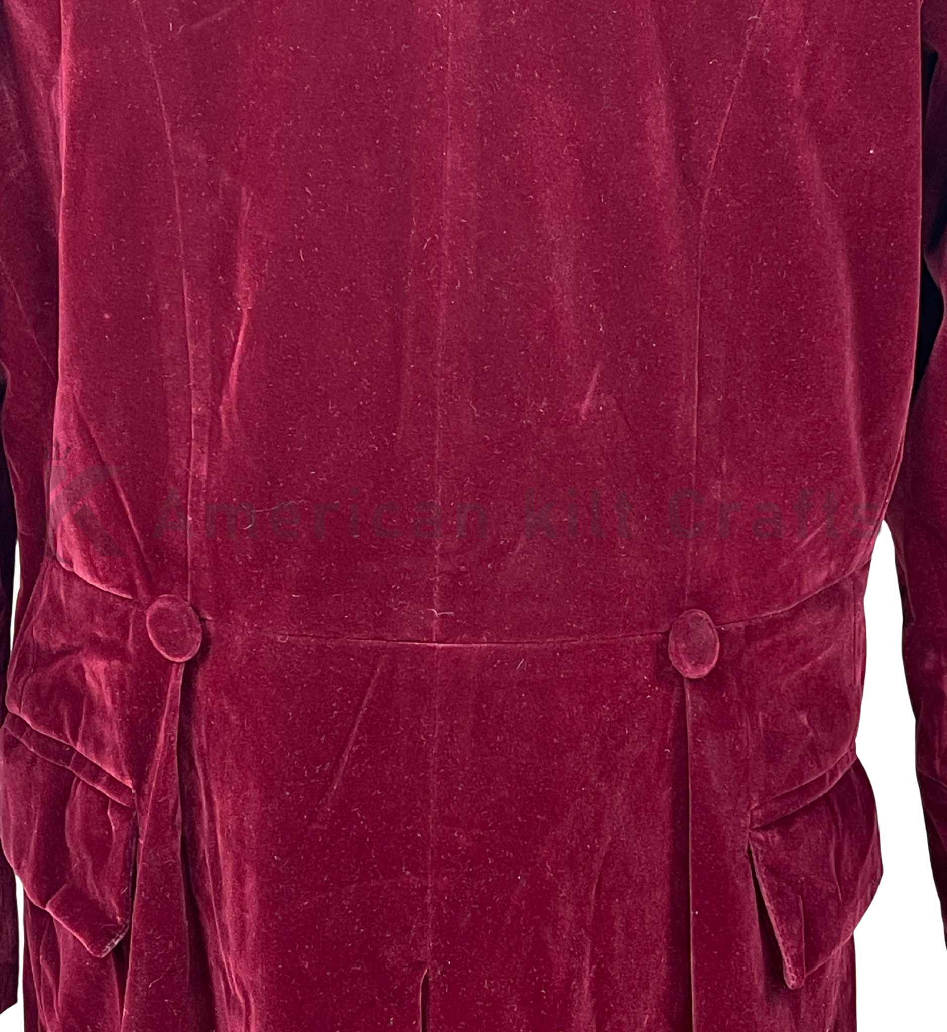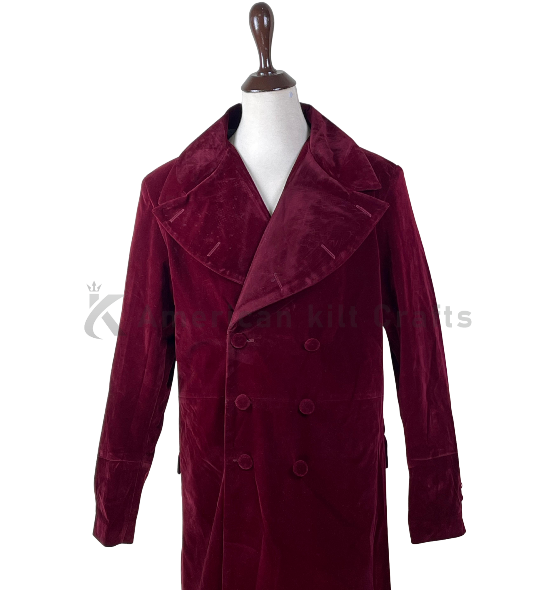 A luxurious maroon velvet frock coat inspired by classic sci-fi television style. Featuring a double-breasted button front, elegant lapel collar, and a timeless vintage silhouette, this coat is crafted for collectors, cosplayers, and fans of iconic statement outerwear.