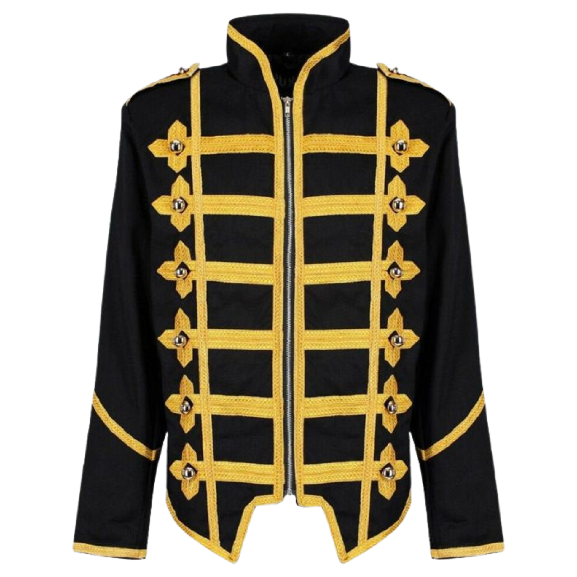 Elevate your style with this Black Parade Steampunk Punk Military Jacket, inspired by classic marching-band aesthetics and iconic MCR drummer fashion. The deep black base paired with striking gold braiding creates a bold, luxurious look suitable for concerts, cosplay, themed events, parties, and fashion wear. Its versatile design blends punk attitude with refined military detailing, making it a standout piece for any wardrobe. Ideal for men seeking a dramatic and stylish statement coat.