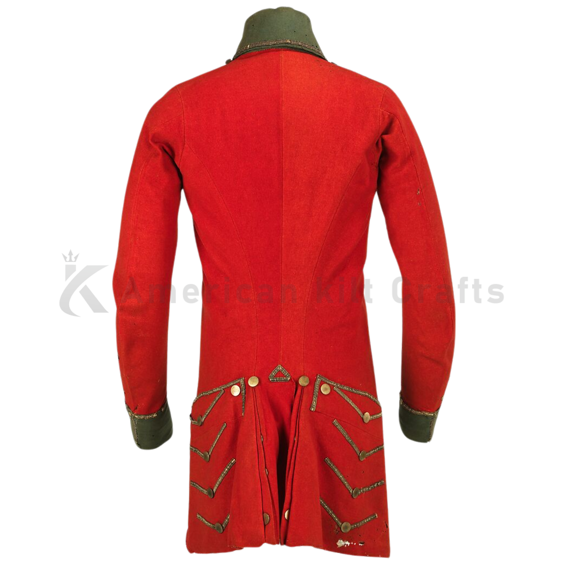 This 18th century British military coatee is inspired by Revolutionary War–era uniforms worn by British regulars and colonial forces. The military jacket features a scarlet red wool body with contrasting green facings, a high stand-up collar, brass-style buttons, and traditional long tails.