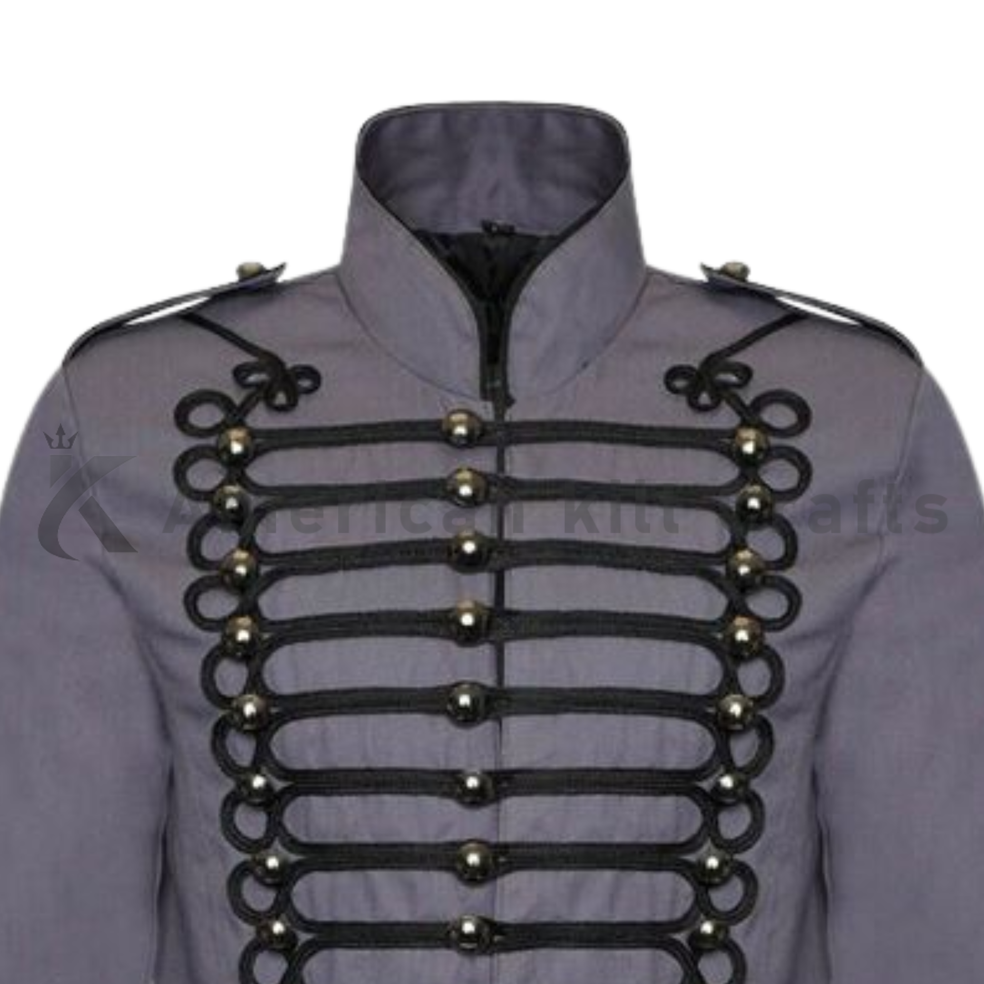 This Military Parade Marching Jacket for men is designed for performance, parade use, and military-style fashion. The jacket is made from high-quality fabric with a soft inner lining for comfort during long wear. The grey jacket features a full front braided design, shiny gold buttons, and clean stitching that gives a sharp and stylish look. The black braiding on the chest and shoulders adds a classic Hussar and marching-band style. The jacket is ideal for parades, stage performances, cosplay events, ceremonies, and themed functions.
