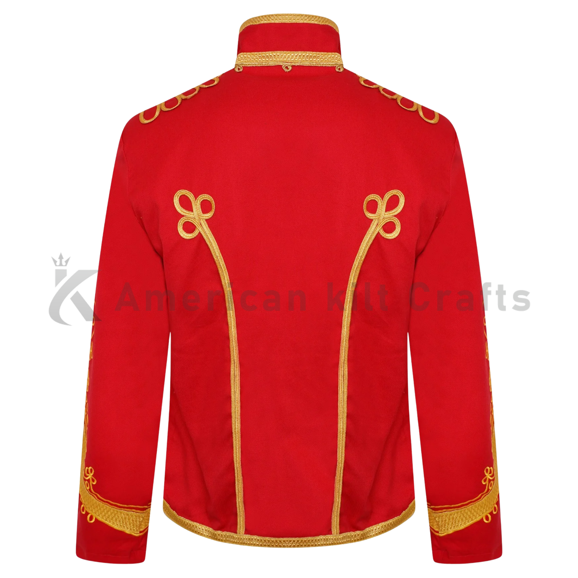 Men's Red Hussar Military Jacket with Gold Braided Embroidery|Parade Style Uniform Jacket