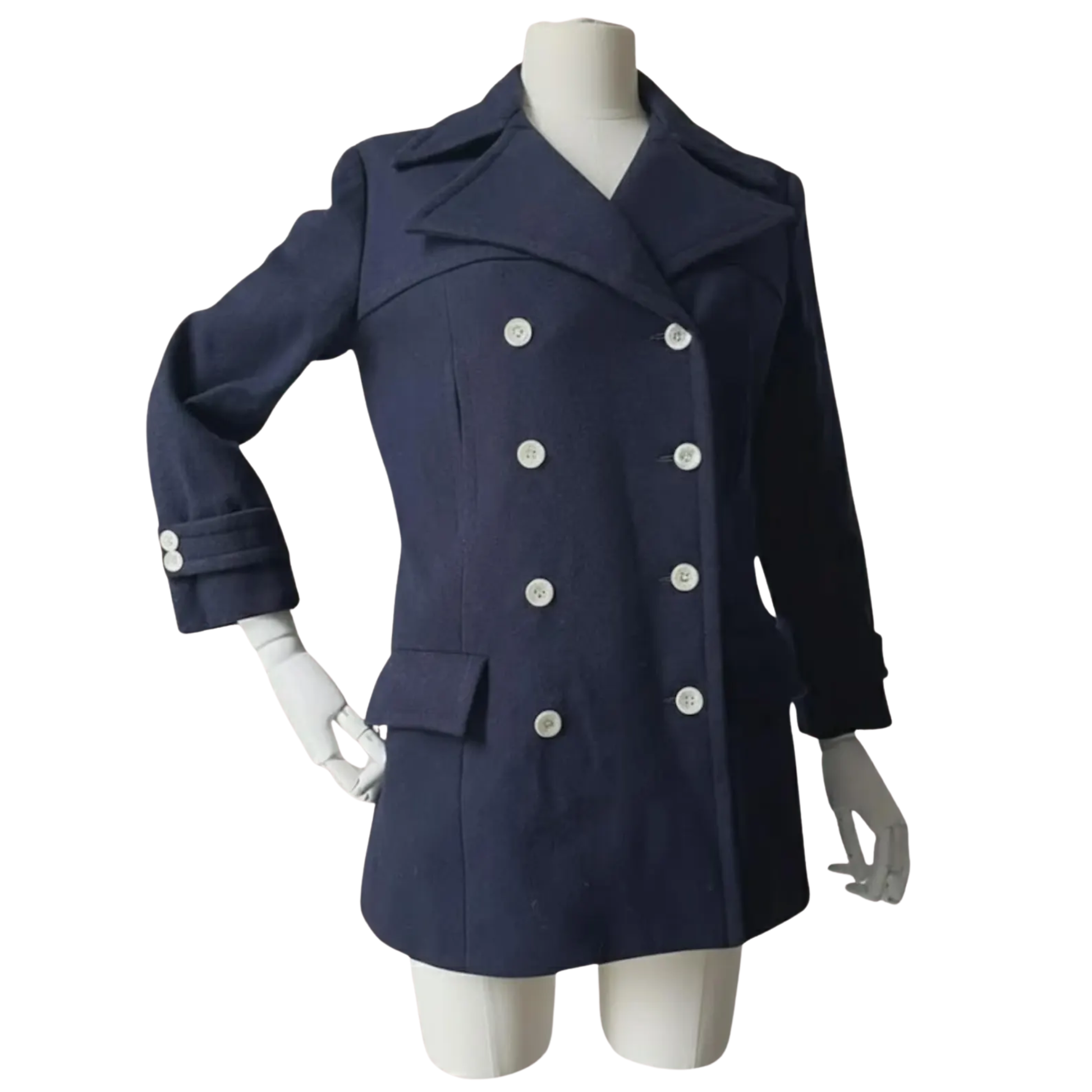 The wide double lapel creates a powerful silhouette inspired by traditional naval uniforms, while two layers of luminous mother-of-pearl buttons enhance its luxurious retro appeal. Designed for both style and functionality, the coat includes two spacious hip pockets and additional bust-side pockets for practical everyday wear.